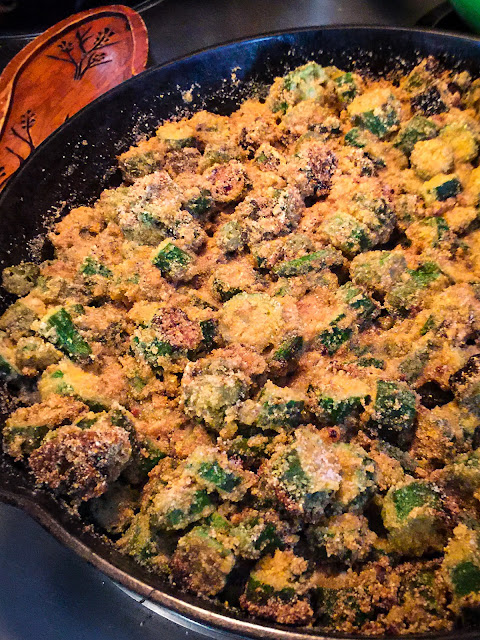 My Mother was an expert at Pan Frying Okra. She could fry it crispy on the outside, almost caramelized shell, and at the same time very tender inside.